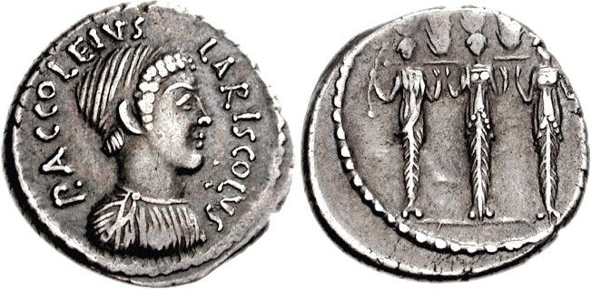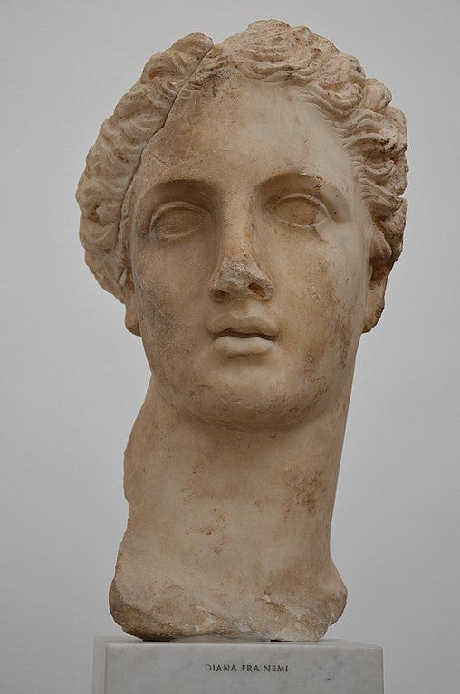 The Sanctuary of Diana-in-the-Wood, as it is also known, was established on the shores of Lake Nemi in a sacred grove. The statue of the goddess was placed in the grove, and a sanctuary was built in the Etruscan era. We know this because the Roman architect Vitruvius noted in the 1st c. BCE that the temple at Nemi was “archaic” and “Etruscan in its form.”[9] The archaic cult image probably stood in the temple until at least 43 BCE, owing to the fact that it appeared on coins until that time. Diana’s archaic image followed the Etruscan Trivia or Diva triformis goddess motif, a “threefold unity of the divine huntress, the Moon goddess, and the goddess of the nether world, Hekate.”[10]