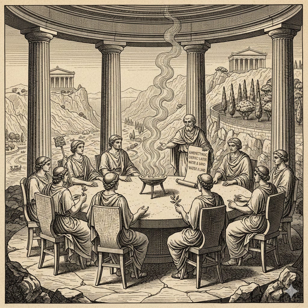 One example of this ancient knowledge is the management of common-pool resources in the ancient Mediterranean. These practices provide a sophisticated historical precedent for modern systems of decentralized governance. While contemporary economic discourse often oscillates between the poles of total privatization and state command, the classical world functioned through a dense web of overlapping jurisdictions, religious mandates, and local communal agreements. This arrangement did not arise from a lack of centralized power, but rather from a recognition that the dignity of the human person and the health of the local ecology were best preserved through local agency and mutual adjustment. By examining primary evidence regarding sacred groves, the management of water through the Attic demes, and the role of the Amphictyonic leagues, it becomes clear that the classical model of resource management was fundamentally multi-centered, viewing the landscape not as an extractable commodity, but as a shared sanctuary.